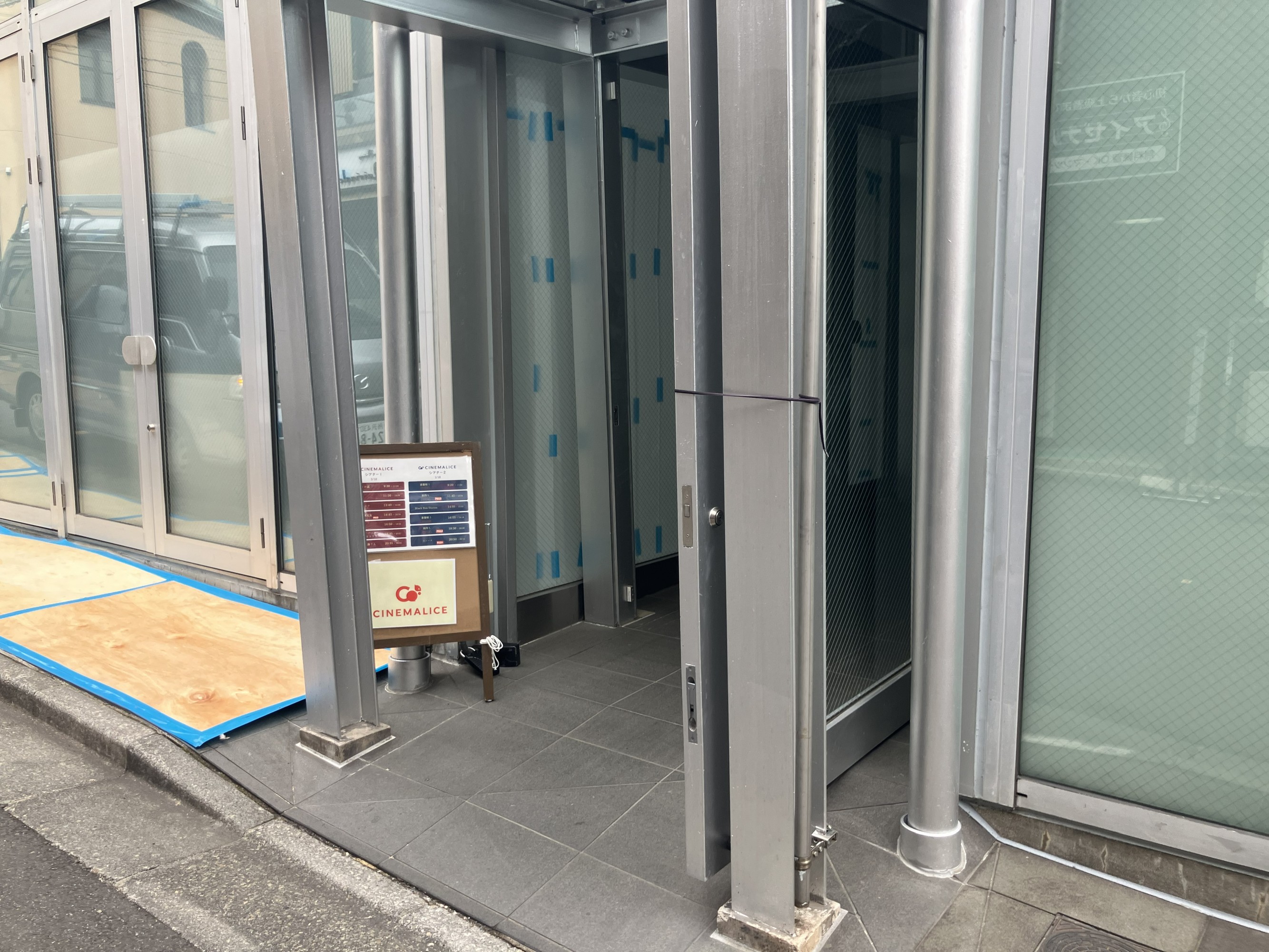 入り口の扉を開けると、ミントグリーン色の小さなフロントが現れた。灰色基調の外観や階段とは一風変わった雰囲気だ。そこには数席の椅子と大きめのテーブル、飲み物などの販売所がある。建物の外観シネマリスやほかのミニシアターで上映されている映画のチラシを眺めながら、静かに上映を待つ。