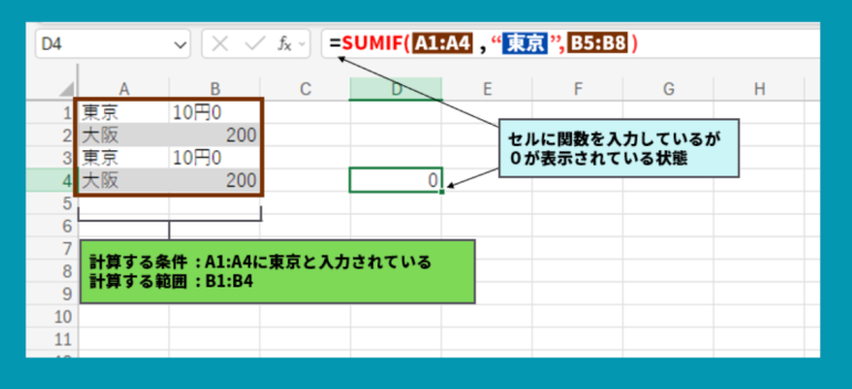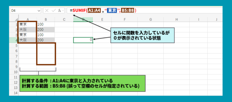 SUMIFは条件範囲と合計範囲の位置を対応させて計算するため、結果が『0』になることがあるのです。