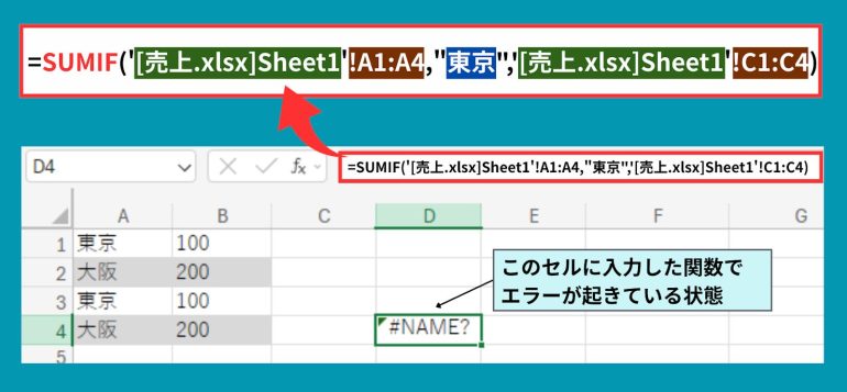 =SUMIF('[売上.xlsx]Sheet1'!A1:A4,"東京",'[売上.xlsx]Sheet1'!C1:C4)