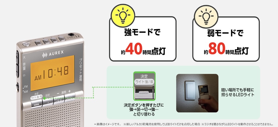 「LEDライトは前機種から搭載されている機能ですが、今回の新製品では「強」、「弱」の2段階切替機能を新しく搭載し、「強」モードでは約40時間、「弱」モードでは約80時間の点灯を可能にしました。夜間や暗がりの中で手元や足元を照らしたり、非常時は「弱」モードでより長時間使用することが可能です」