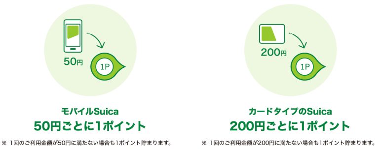 まず、SuicaはモバイルSuicaがおすすめです。JR東日本エリアの電車に乗った場合、カードタイプのSuicaだと電車運賃の200円につき1ポイント貯まります。一方、モバイルSuicaだと50円につき1ポイント貯まるのです。電車に乗るだけでこんなにもポイント還元が違うので、断然モバイルSuicaがおすすめです。