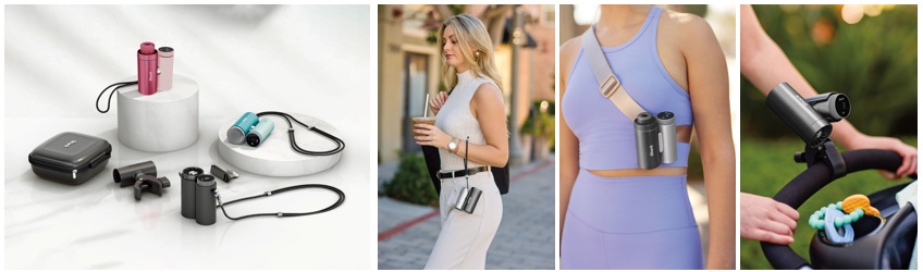 さまざまなスタイルで使えるフレキシブル設計なのも特徴で、ハンディファンとしてはもちろん、省スペースな卓上ファンとして使用することも可能。さらに、ストラップやクリップ、クランプなどの専用アクセサリーも用意しており、首からぶら下げてハンズフリーで使えるほか、クリップやクランプを使ってバッグやベルト、トレーニングマシンやベビーカーなど色々な場所に取り付けて使用することもできる。