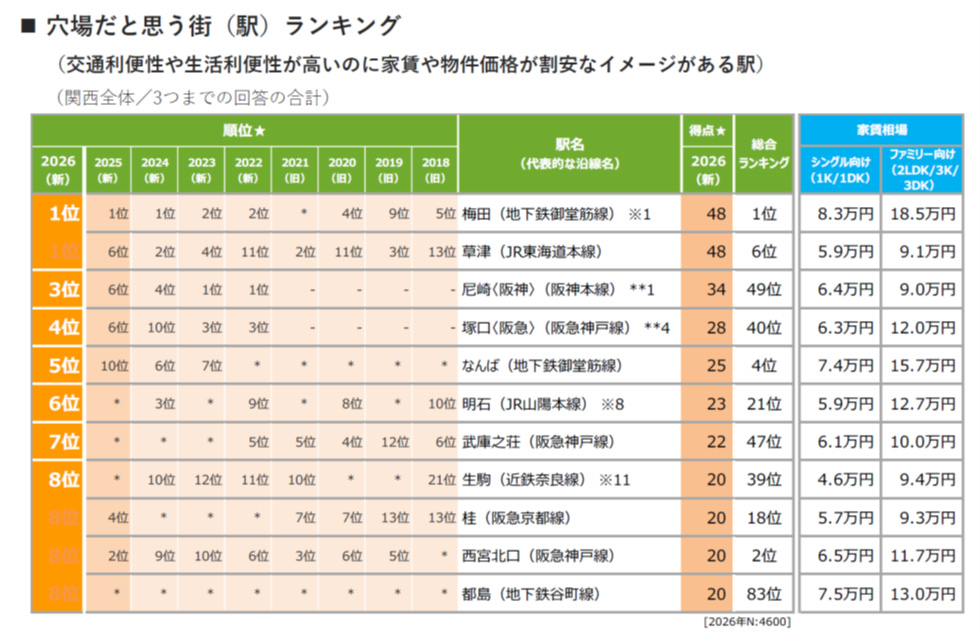 関西の穴場だと思う街(駅)ランキングでは、「梅田」が3年連続して1位。同点1位の「草津」は過去最高位を更新した。また、「生駒」「都島」は昨年のランク外から過去最高位を更新して8位となった。