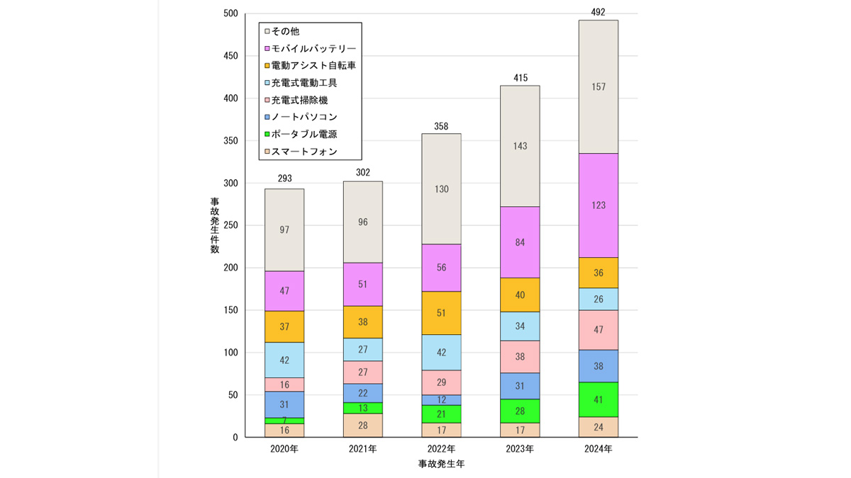 「近年の、リチウムイオン電池搭載製品の需要増加や多様化の影響を受けて、事故も年々増加傾向にあります。製品別では『モバイルバッテリー』の事故が最も多く、2024年は2022年比で2倍以上に増加しています。これは、2023年5月に新型コロナウィルス感染症が5類感染症になったことで行動範囲が広がったことや、防災用品としての需要が高まっていることなどが要因にあると考えられます。