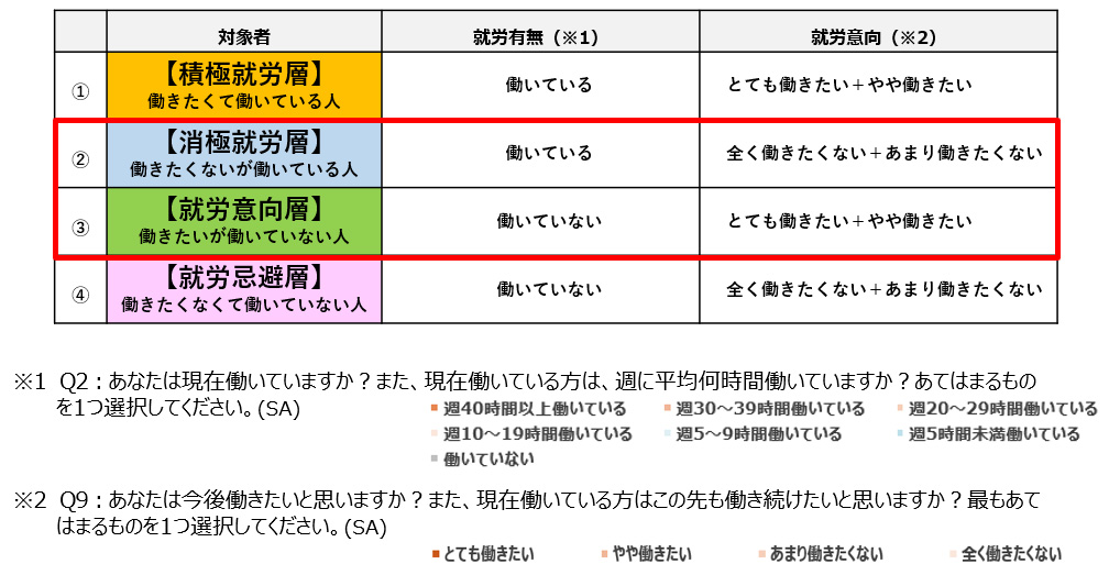 特に、「消極就労層」は働きながら、どのような不安や不満を持っているのか、「就労意向層」は働きたい思いがあるにもかかわらず働けていない理由や就労前の不安、希望する条件があるのかを探るために注目して分析をしている。