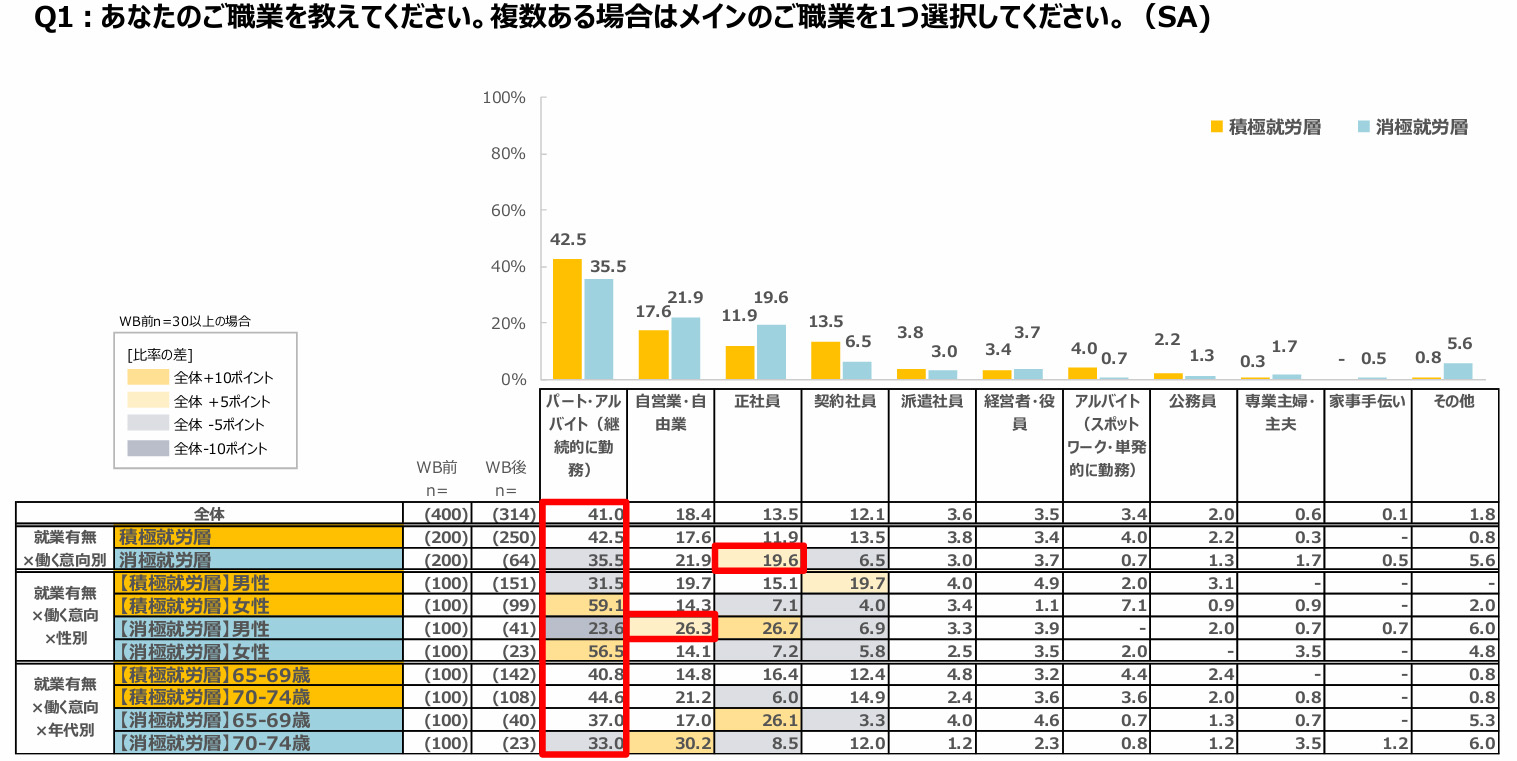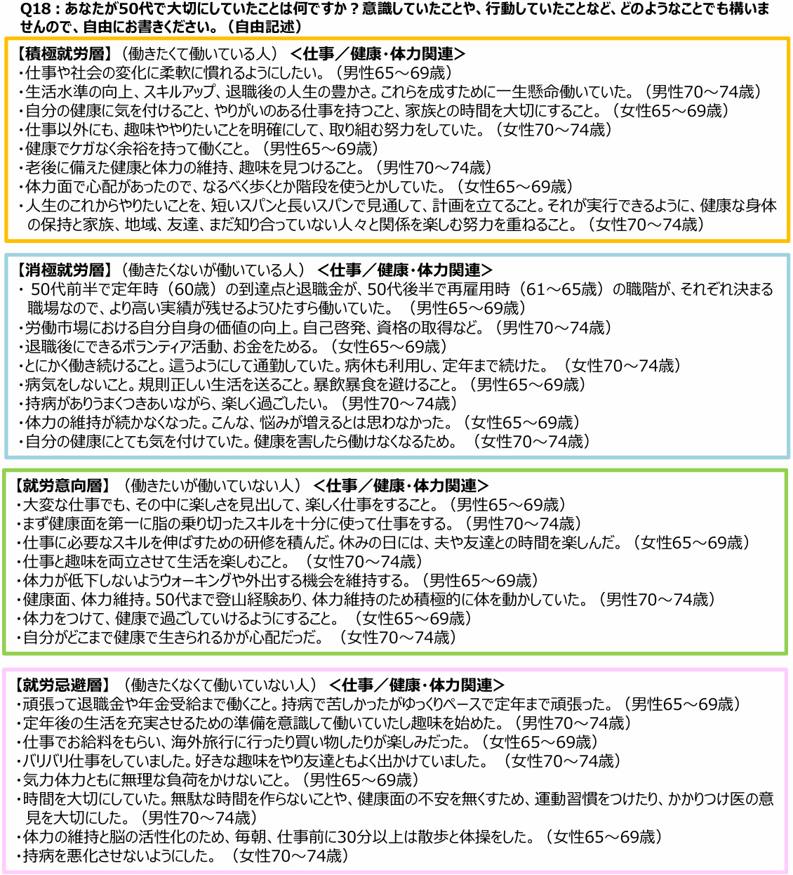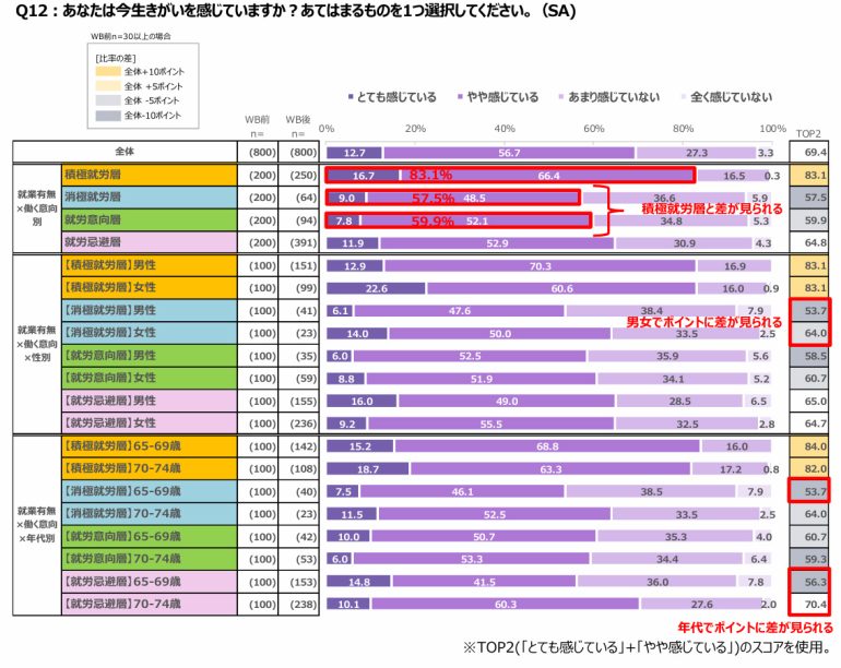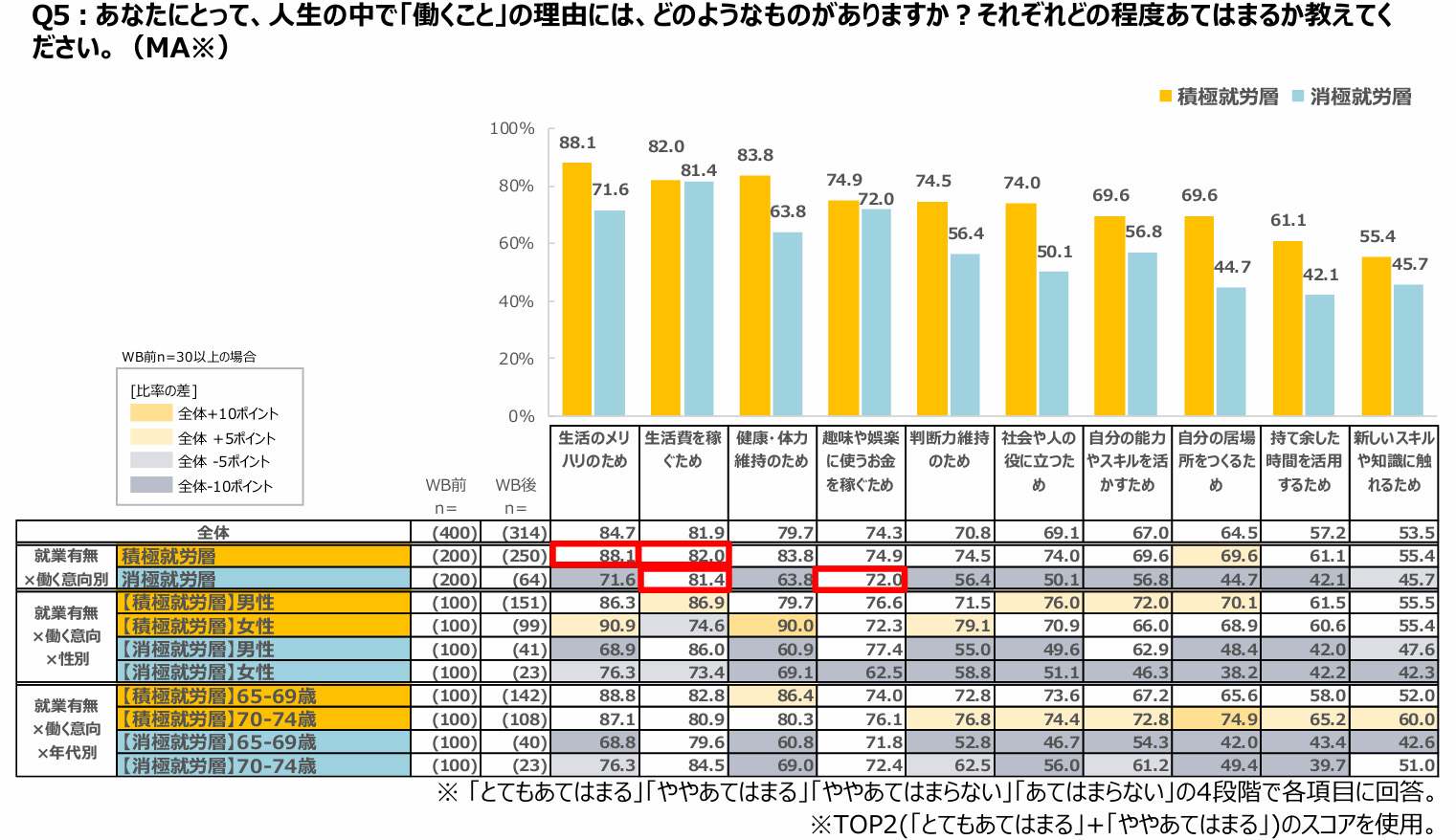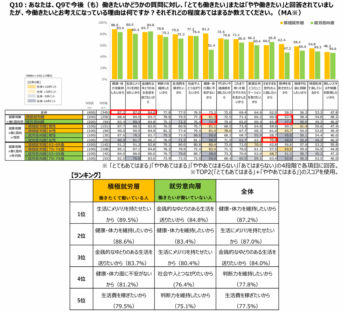 積極就労層と就労意向層とでは「健康・体力面に不安がないから」「精神を安定させたいから」の項目でポイント差が目立った。また、就労意向層の女性はさまざまな世代と話したいという希望が多い。