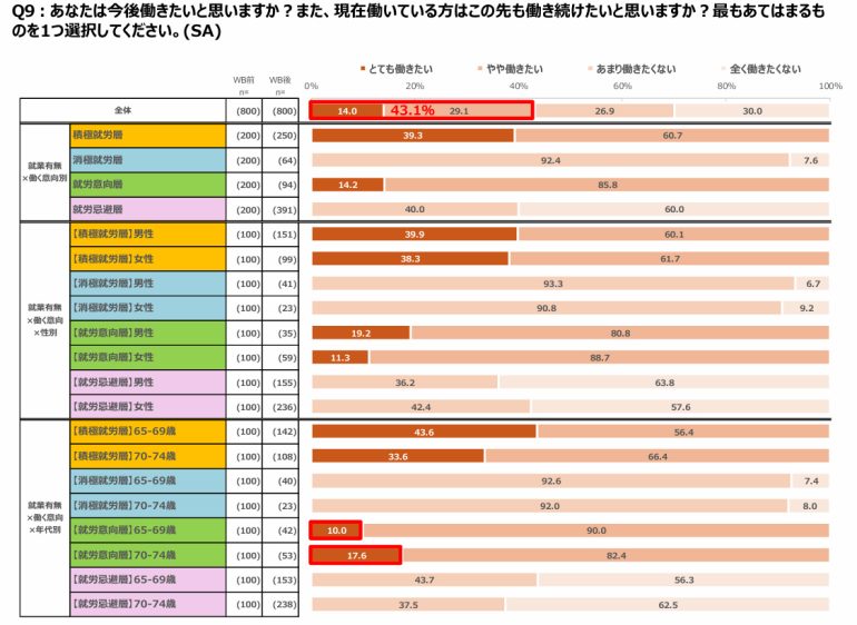 今後(も)働きたいと思うかを尋ねたところ、全体では43.1%が働きたいと回答した。「就労意向層」では65~69歳よりも、70~74歳のほうが働きたい意向が強い。