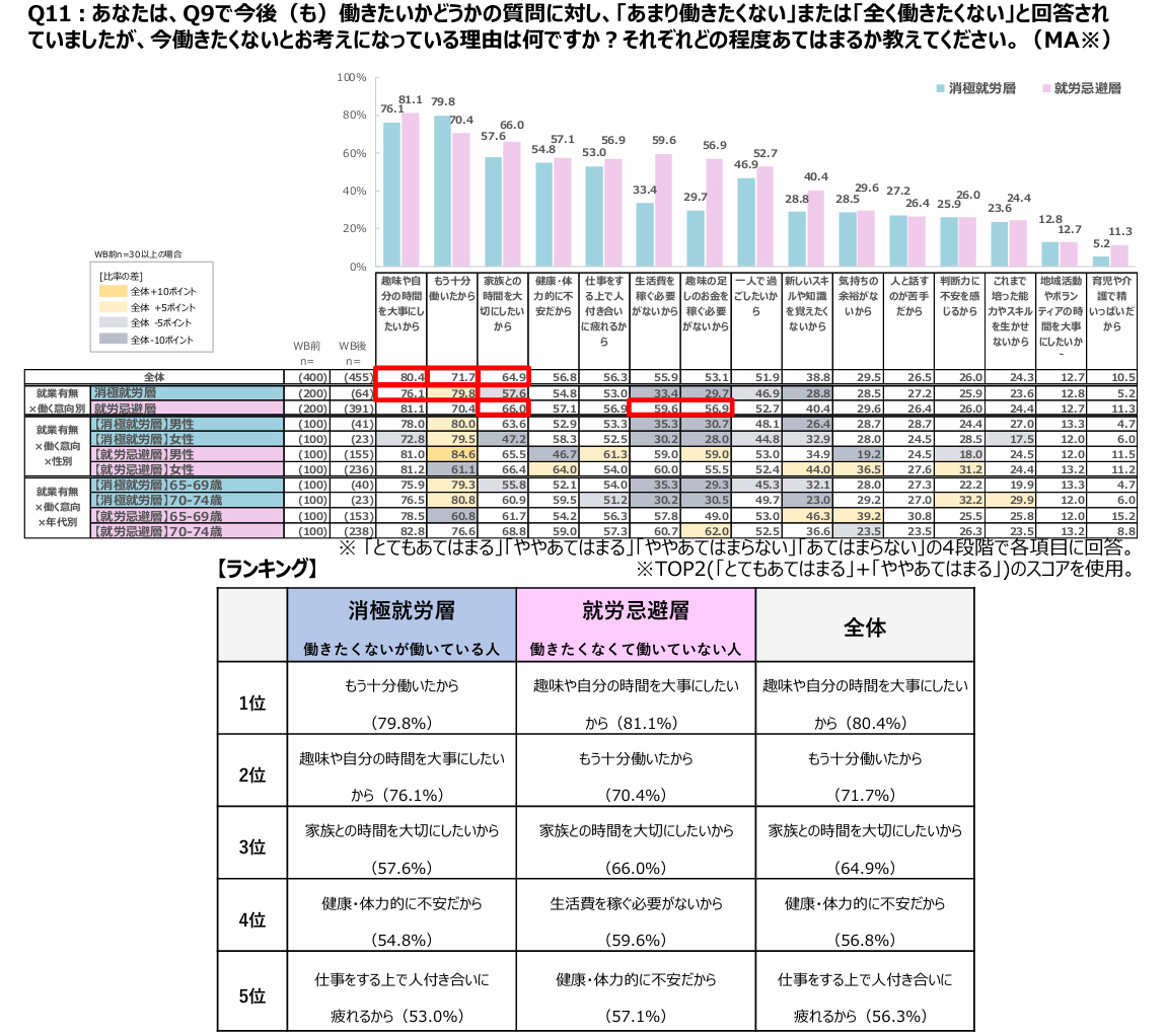 消極就労層は、1位が「もう十分働いたから」 で79.8%、2位が「趣味や自分の時間を大事にしたいから」で76.1%、3位が「家族との時間を大切にしたいから」57.6%という結果で、自分のプライベートを充実させたい傾向があることがわかった。