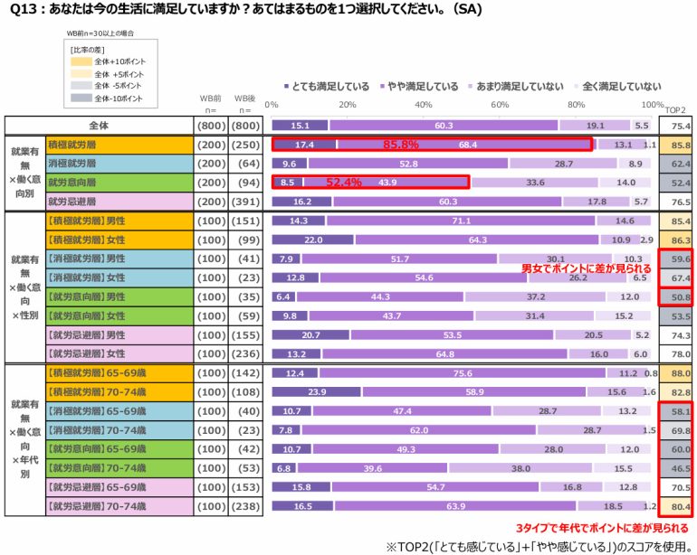 今の生活に満足をしているか尋ねたところ、積極就労層が85.8%、就労忌避層が76.5%、消極就労層が62.4%、就労意向層が52.4%と続いた。