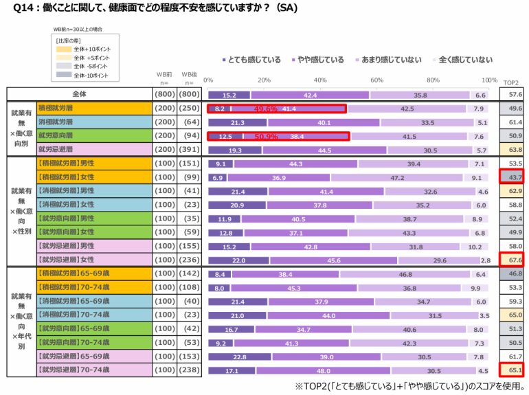 性別で見ると、就労忌避層の女性が67.6%で最も高く、積極就労層の女性が43.7%で最も不安が少なかった。年代別で見ると、就労忌避層の70~74歳が65.1%で最も高く、積極就労層の65~69歳が46.8%で最も不安が少なかった。