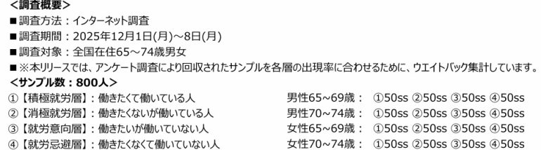 2026年2月12日(木)に発表した「アラウンド古希(65~74歳)の生きがい、働きがいに関する意識調査」から、回答者の就労有無と就労意向を掛け合わせることでアラウンド古希を4タイプに分類し、勤労観や生きがい・満足感、健康面・体力面の不安などを探った。
