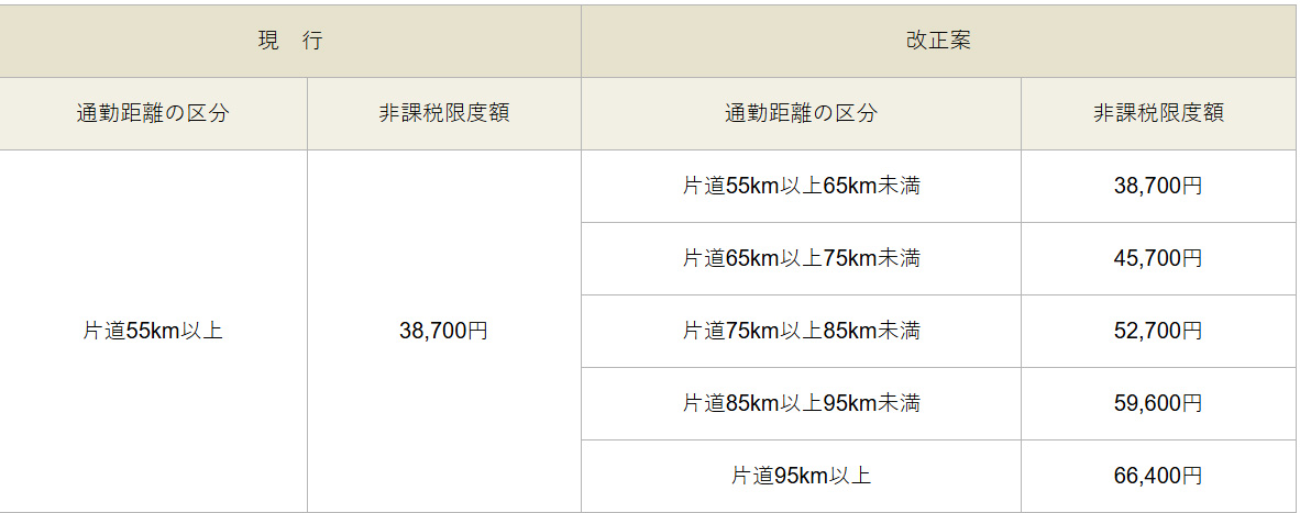 マイカー通勤者は、高速道路で通勤していることが多く、それに加えてガソリン代の高騰により、ガソリン代の値上がり分も支給された場合には非課税上限を超え、給与として課税対象となってしまう可能性があった。片道65km以上では、従来の38,700円の非課税限度額から45,700円へ7,000円非課税額が上がったことにより、年間84,000円の非課税額が上がり、所得税率20%の人ならば、住民税の所得割10%と併せて、25,200円の減税となる。ただ、1日あたりのマイカー通勤の平均通勤距離が片道10.5kmであり、今回の非課税上限額引き上げの改正の対象となる片道65km以上は、片道2時間近く運転することになり、かなり対象者は少ないと考えられる。