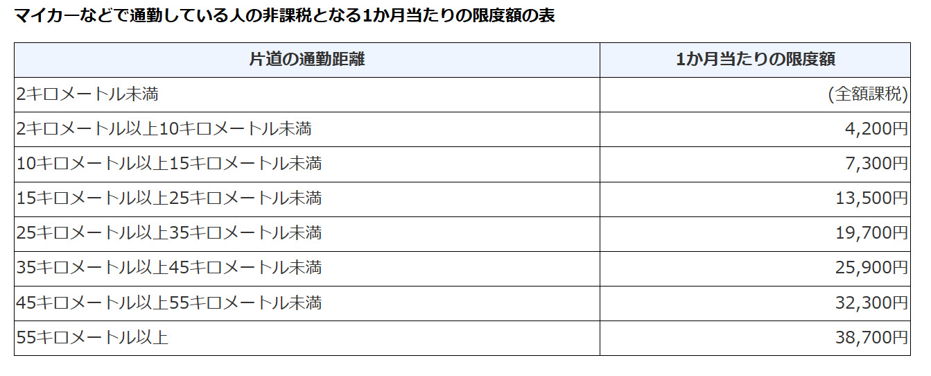 車やバイクによる通勤に対して手当が出ている場合は、以下のように距離数によってその非課税限度額が定められている。