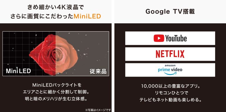 いずれも、高いコントラスト表現を実現するMini LEDバックライトを搭載した4K液晶テレビ。エリアごとにバックライトを消灯することで、液晶パネル特有の黒画面の白浮きを抑制し、“深い黒”を表現。液晶パネルの特徴である“まばゆい白”も引き立てる。