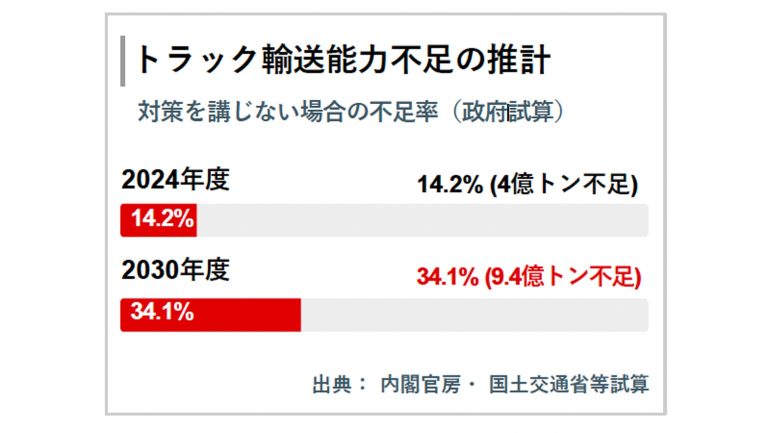 2024年4月の働き方改革関連法施行により、トラックドライバーの時間外労働が年間960時間に制限され、輸送体制は大きな転換期を迎えた。国土交通省の試算では、2030年度には約34%(約9億トン相当)の輸送力不足が見込まれている。