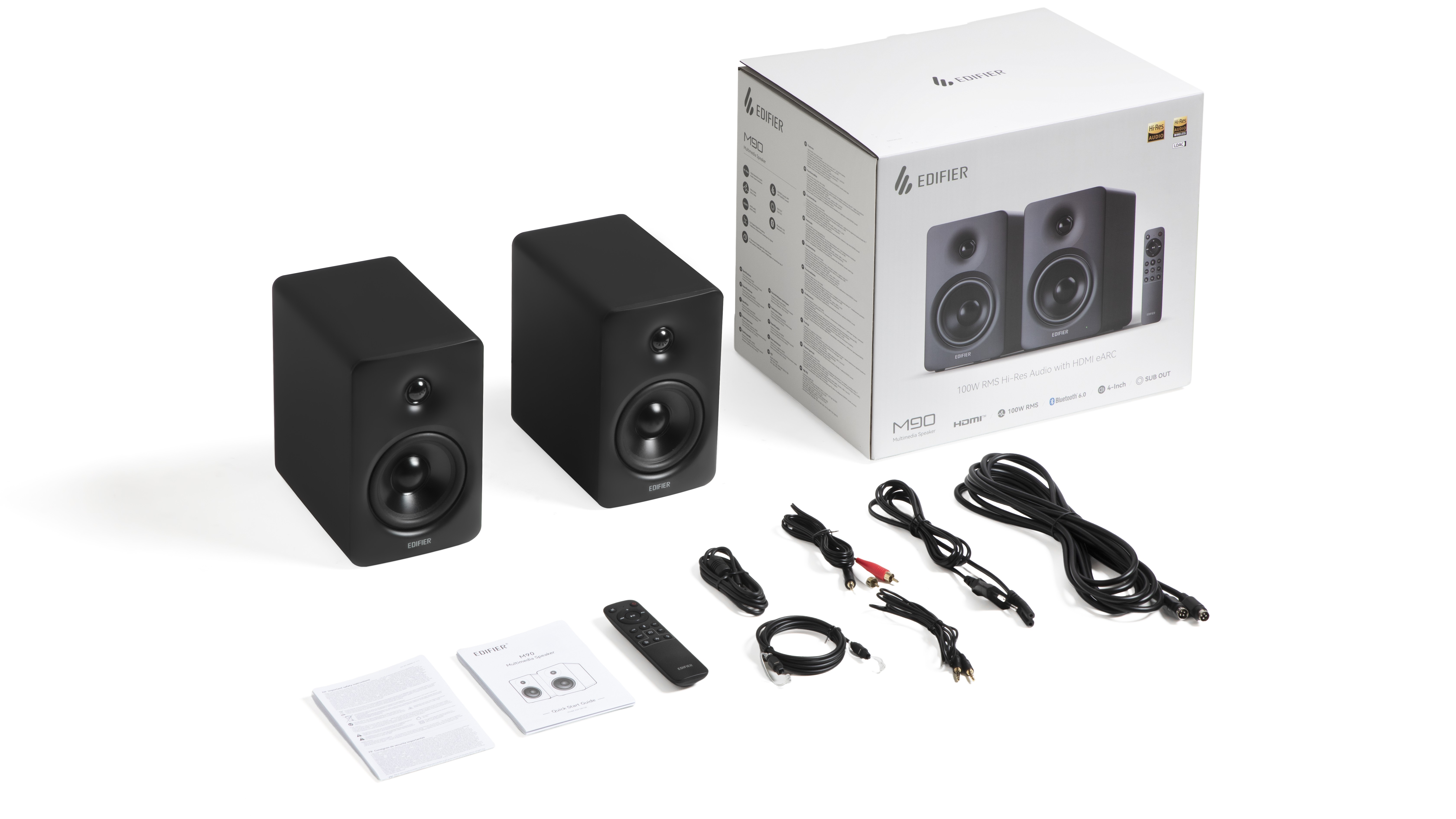 パッケージ内容:M90本体、電源コード(1.8m)、スピーカー接続ケーブル(5m)、光デジタルオーディオケーブル(1.5m)、USB-C to USB-C ケーブル(1.2m)、3.5mm to RCA オーディオケーブル(1.7m)、3.5mm to 3.5mm オーディオケーブル(1.7m)、リモコン、単4形乾電池×2、クイックスタートガイド、安全に関する重要事項