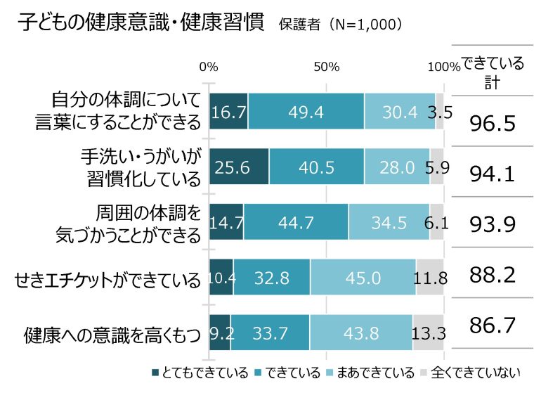 次に子どもの健康意識・健康習慣について、保護者を対象に「できているかどうか」を4段階で調査した(とてもできている/できている/まあできている/全くできていない)。