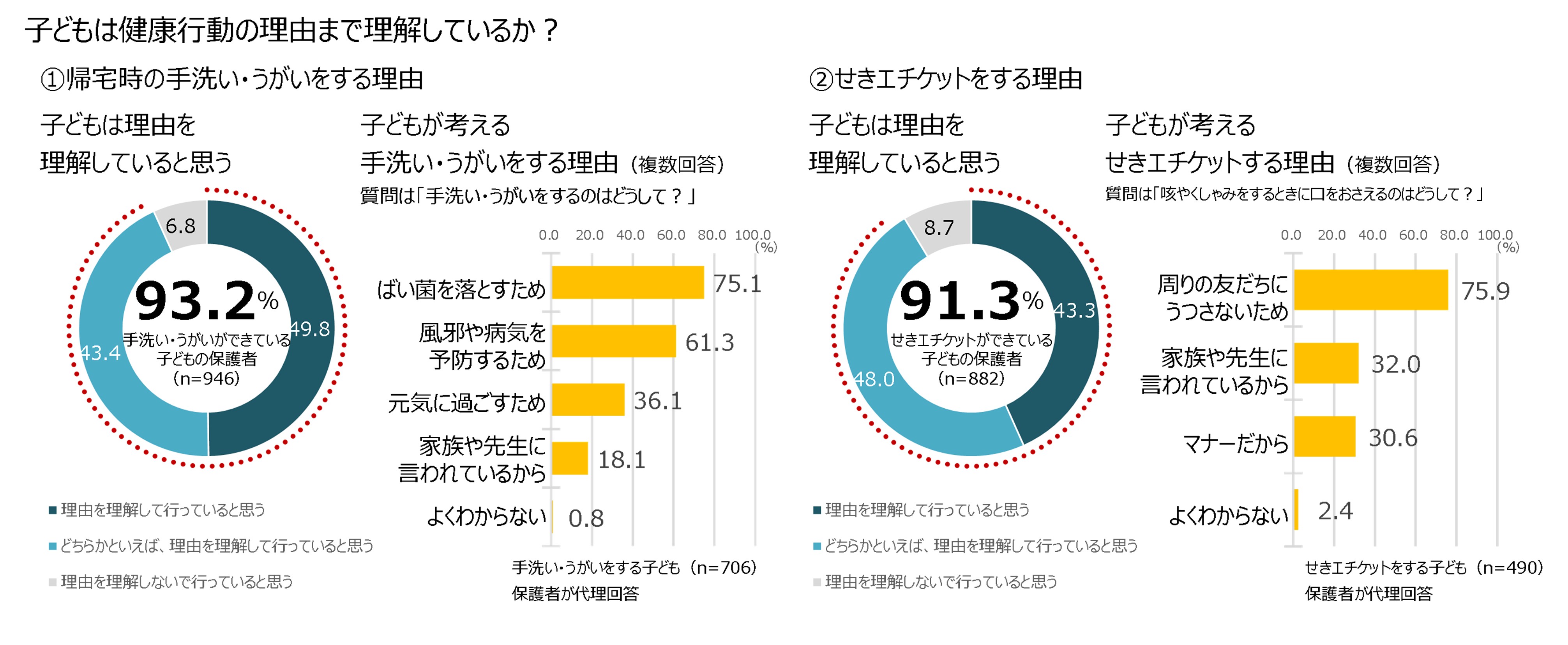 健康行動には行う理由があるが、子どもはその理由まで理解しているのか、保護者に聞いた。「帰宅時の手洗い・うがい」について、保護者の49.8%が「理由を理解して行っていると思う」、43.4%が「どちらかといえば、理由を理解して行っていると思う」と回答した。これらを合計すると、93.2%の保護者が、子どもは手洗い・うがいを行う理由を理解していると捉えていることがわかった。