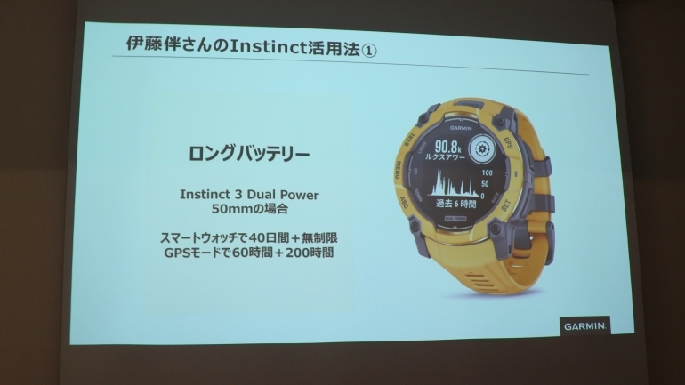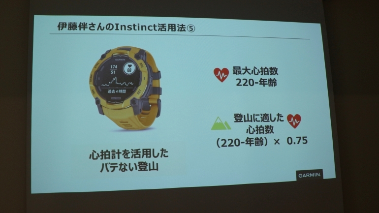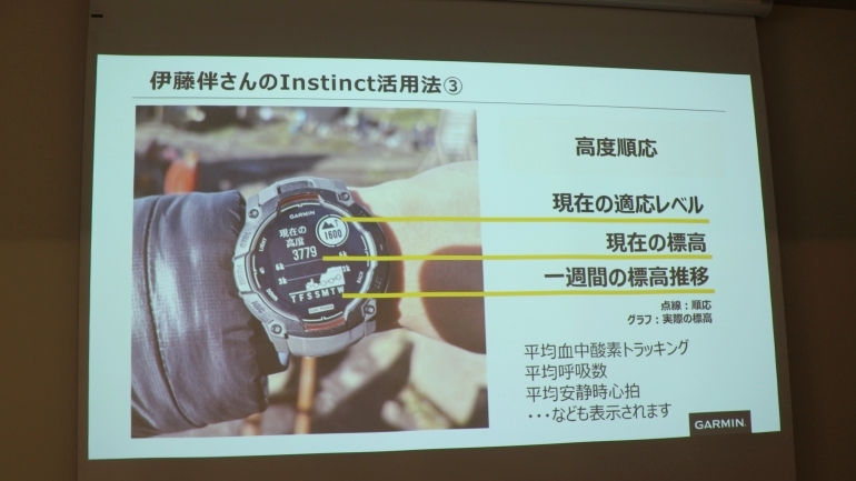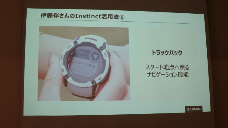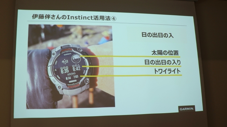 トークセッションの後半では、伊藤氏が実際の登山において「Instinct 3」シリーズの機能をどのように活用しているか、6つのお気に入りポイントが紹介されている。