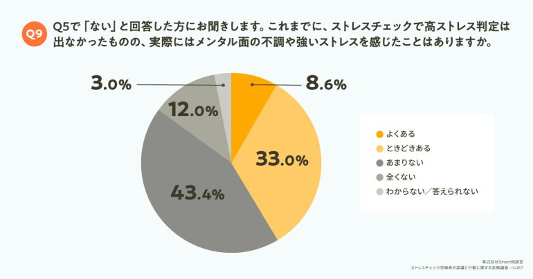 Q5で「ない」と回答した人に対して、「Q9. これまでに、ストレスチェックで高ストレス判定は出なかったものの、実際にはメンタル面の不調や強いストレスを感じたことはありますか。」(n=267)と質問したところ、「よくある」が8.6%、「ときどきある」が33.0%という回答となった。
