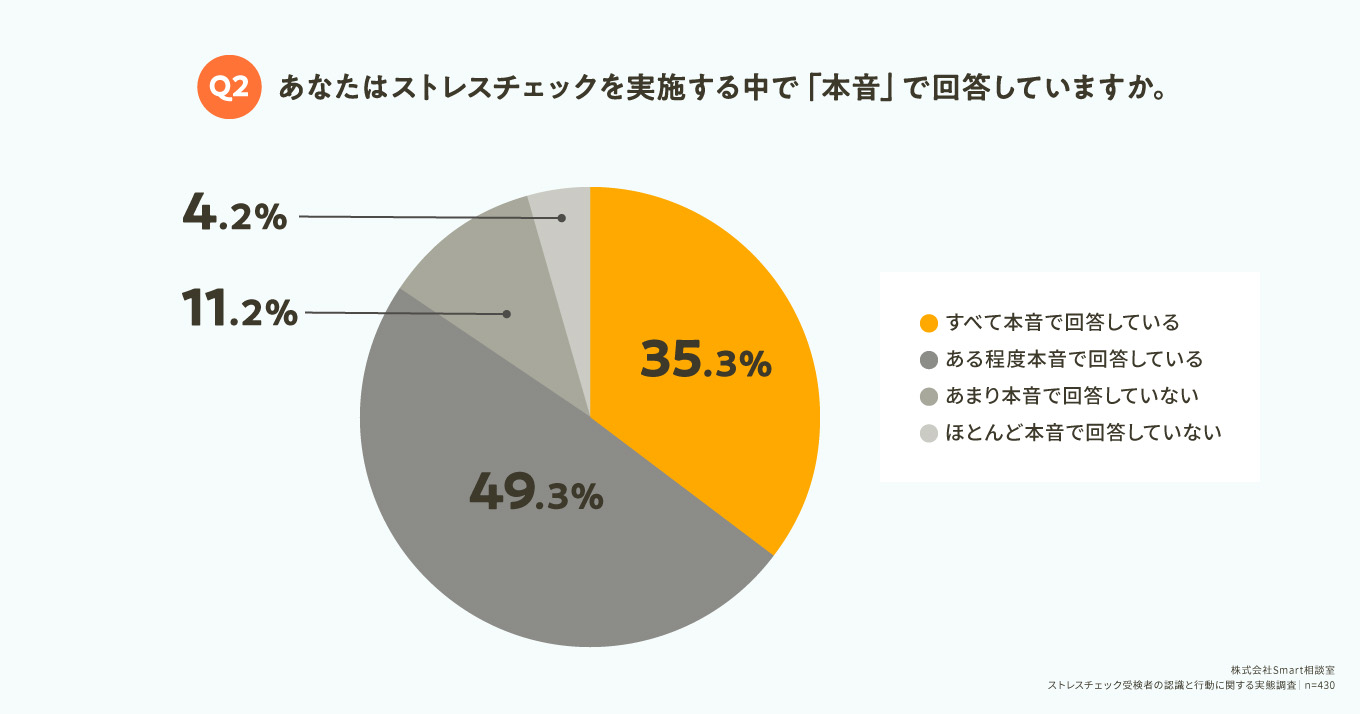 「Q2. あなたはストレスチェックを実施する中で「本音」で回答していますか。」(n=430)と質問したところ、「すべて本音で回答している」と回答した人は35.3%という結果に。