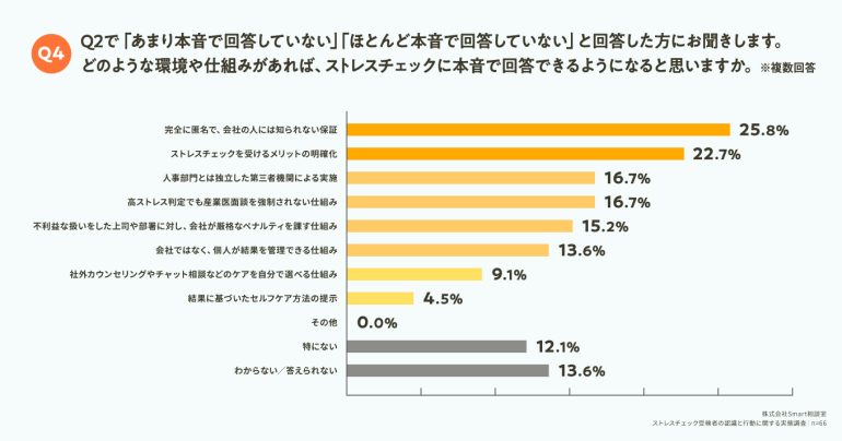 Q2で「あまり本音で回答していない」「ほとんど本音で回答していない」と回答した人に対して「Q4. どのような環境や仕組みがあれば、ストレスチェックに本音で回答できるようになると思いますか。(複数回答)」(n=66)と質問したところ、「完全に匿名で、会社の人には知られない保証」が25.8%、「ストレスチェックを受けるメリットの明確化」が22.7%という回答となった。