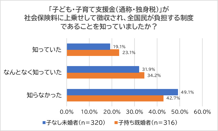 「『子ども・子育て支援金(通称・独身税)』社会保険料に上乗せして徴収され、全国民が負担する制度であることを知っていたか?」を聞いたところ、「知っていた」と回答した人は既婚者・未婚者ともに2割程度(子なし未婚者:19.1%、子持ち既婚者:23.1%)となった。