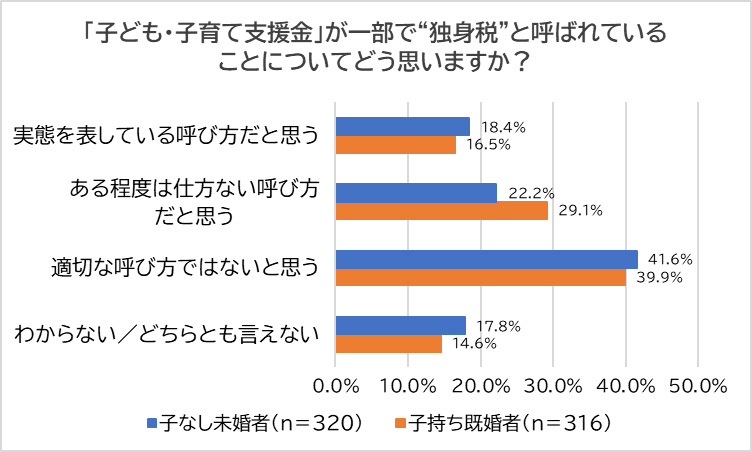 「『子ども・子育て支援金』が一部で“独身税”と呼ばれていることについてどう思うか?」を聞いたところ、既婚者・未婚者ともに最も多かった回答は「適切な呼び方ではないと思う」(子なし未婚者:41.6%、子持ち既婚者:39.9%)となった。