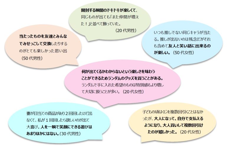 ランダムグッズに関する思い出やエピソードを自由回答で尋ねたところ、開封する瞬間のワクワク感や非日常感を楽しむ声のほか、家族や友人と中身を開けて喜びを共有した体験、子どもの頃にはできなかった“大人買い”を楽しむ声などが寄せられた。ランダムグッズならではの「何が出るかわからない楽しさ」が、印象的な思い出として残っている様子がうかがえる。