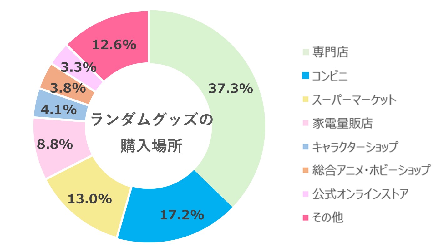 直近の購入場所では、トップ3が「専門店」(37.3%)、「コンビニ」(17.2%)、「スーパーマーケット」(13.0%)という結果になり、購入目的で2位、3位にあがった、「店頭でたまたま見かけた」「運試しをしたい」の結果にも関連して、日常でふらっと見かけて気軽に楽しめるコンテンツとして親しまれていることがわかった。