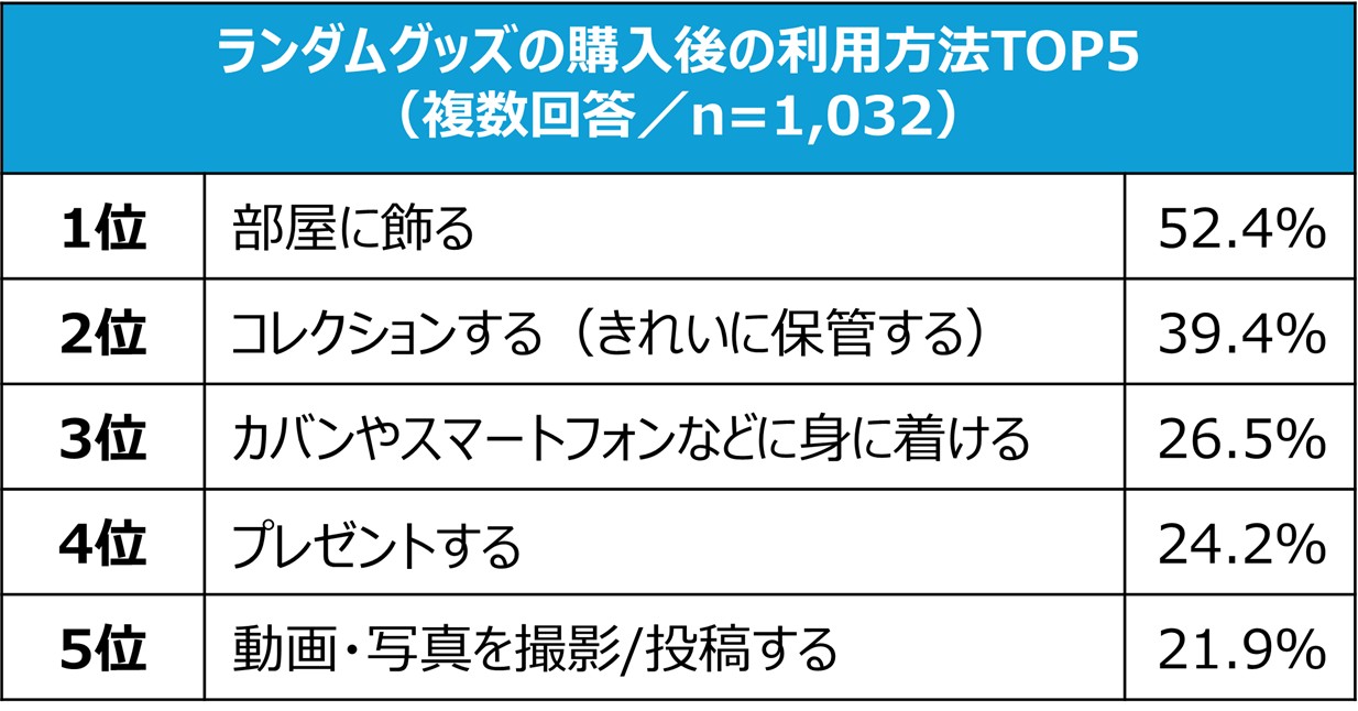 ランダムグッズの購入後の楽しみ方について、「部屋に飾る」が52.4%と最も多い結果になった。次いで「コレクションする(きれいに保管する)」が39.4%、「カバンやスマートフォンなどに身に着ける」が26.5%と、使用用途に合った利用が9割弱にのぼり、体験として楽しまれた後もランダムグッズは“生活の一部”として楽しまれていることがわかった。