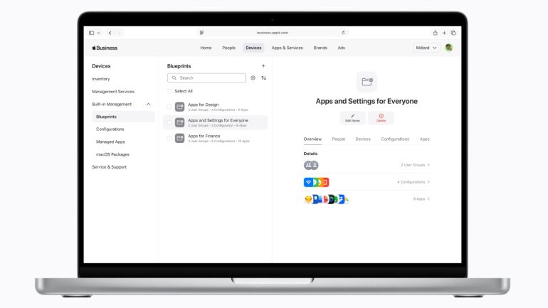 Apple Businessにはモバイルデバイス管理(MDM)が内蔵されており、組織のApple製デバイスや設定などを1つのインターフェイスで包括的に管理することができる。