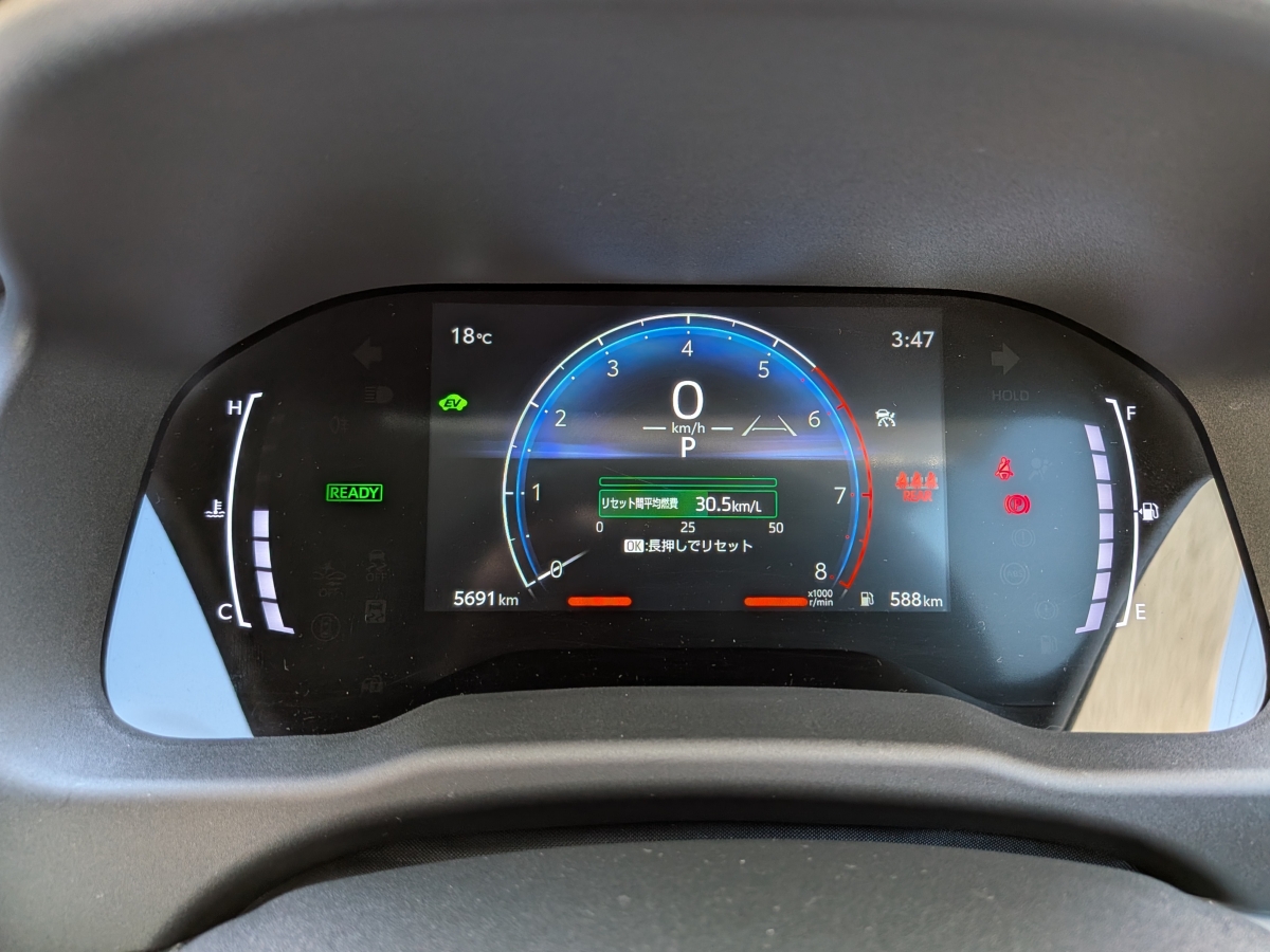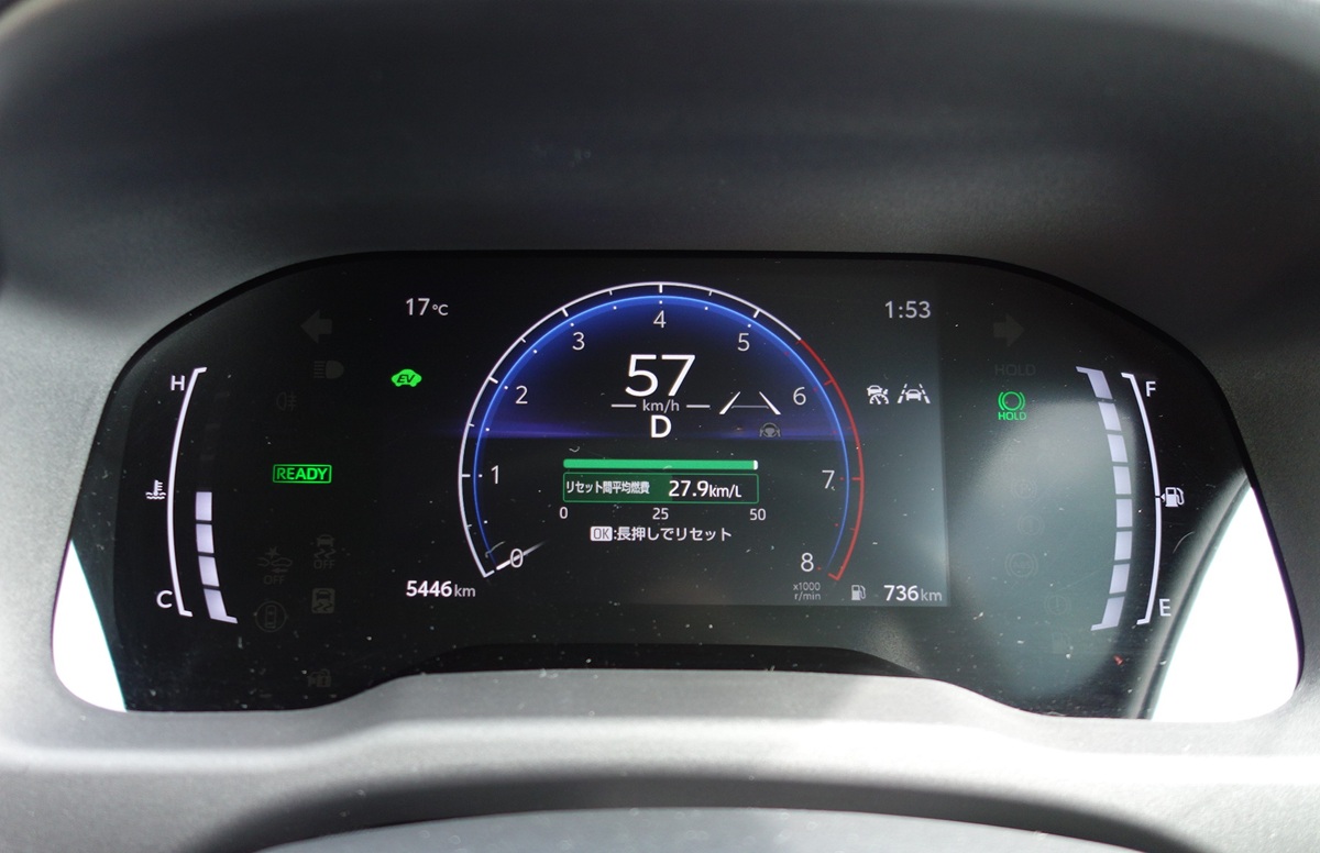 駐車、Uターンでは思ったほど小回りが利かない(最小回転半径は標準の15インチタイヤで5.2m、16インチタイヤは5.3m)という印象はさておき、車内の静かさはコンパクトカーとして一級だ。さすがにハイブリッドシステムの洗練度は最新のトヨタハイブリッドシステムを搭載するプリウスなどには敵わないものの、EV走行の機会が多い一般道、首都高走行時の実燃費は30km/L越えの素晴らしい実燃費性能を確認。