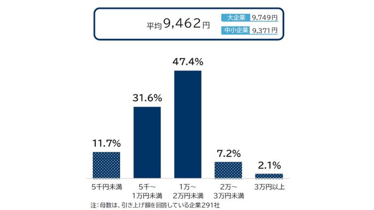 平均引き上げ額は9,462円に上昇、「大企業」が「中小企業」を上回る、初任給額「25万~30万円未満」は2割近くに