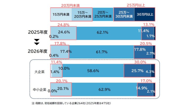 2026年度の初任給の金額を尋ねたところ、「20万~25万円未満」の企業の割合が61.7%(前年度比0.4ポイント減)で最も高くなった。
