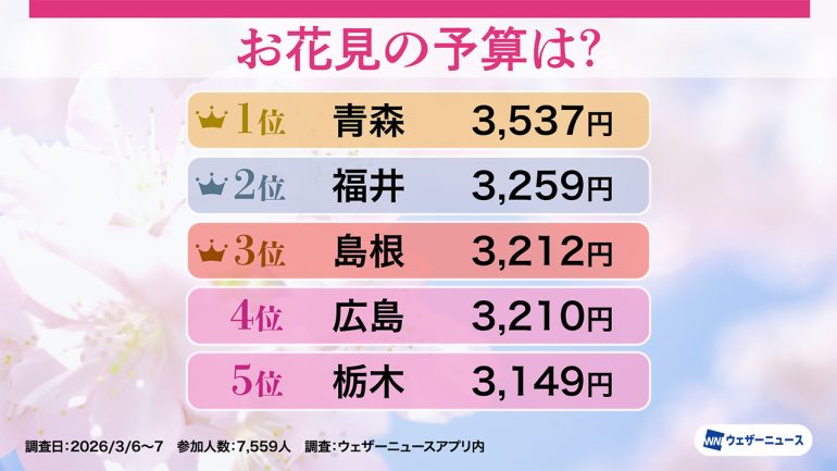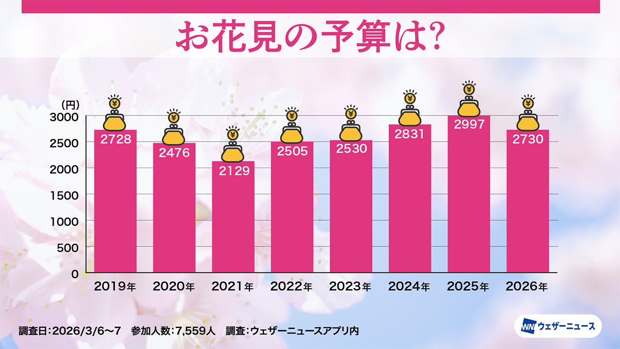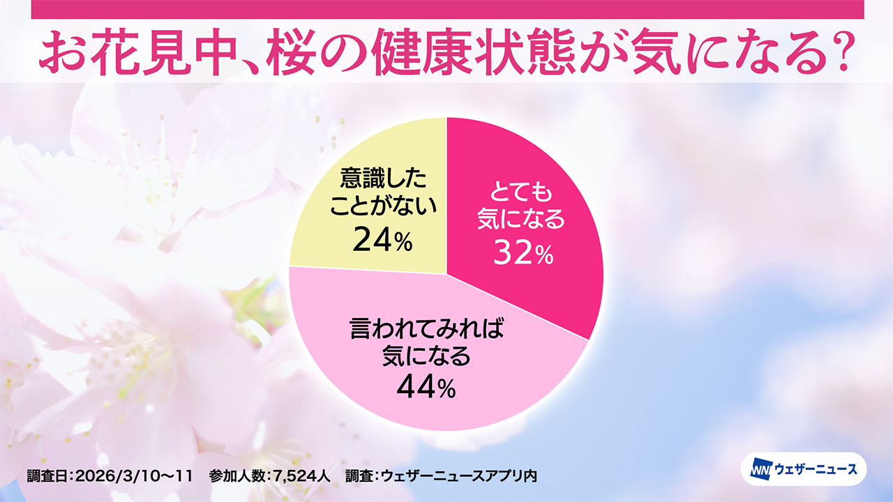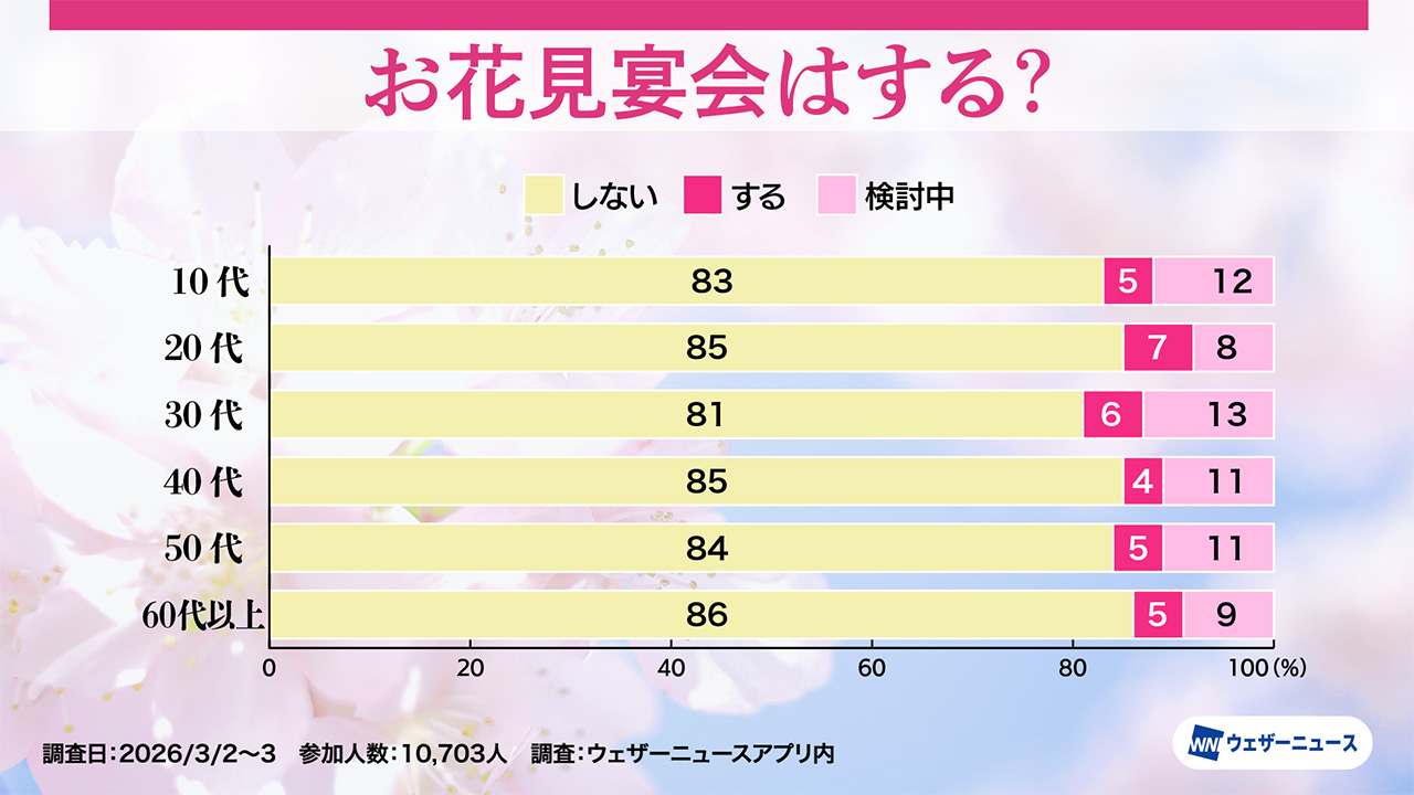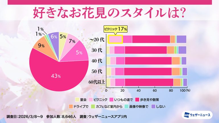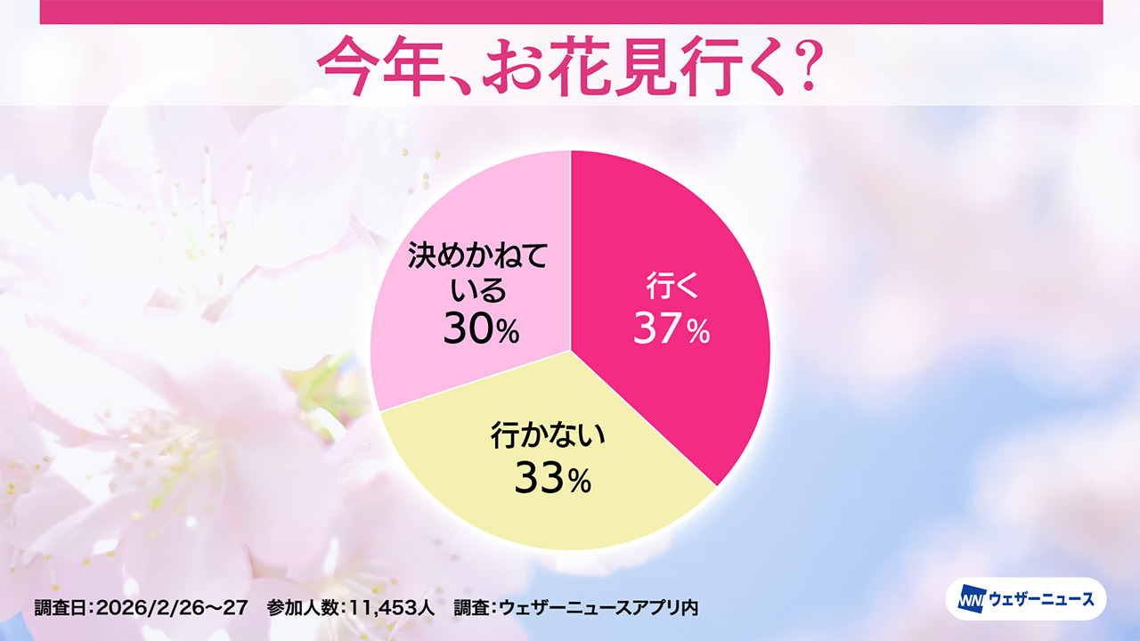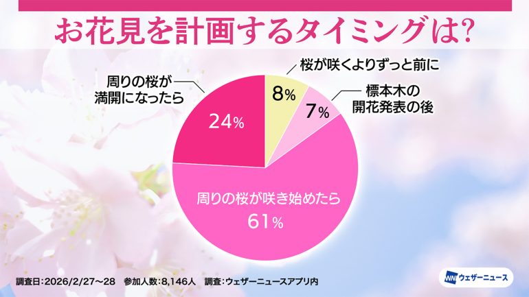 ウェザーニューズは、今年のお花見への意識や人気のお花見スタイルを調査するため、スマホアプリ「ウェザーニュース」を通じて「お花見調査2026」を実施し、その結果を発表した。