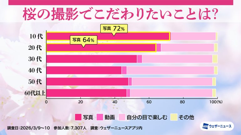 「桜の撮影でこだわりたいことは?」という質問をし、「写真」「動画」「自分の目で楽しむ」「その他」の4択で選択してもらった。桜の記録か、それとも記憶か、世代間のスタイルの違いが以下のように明らかに。