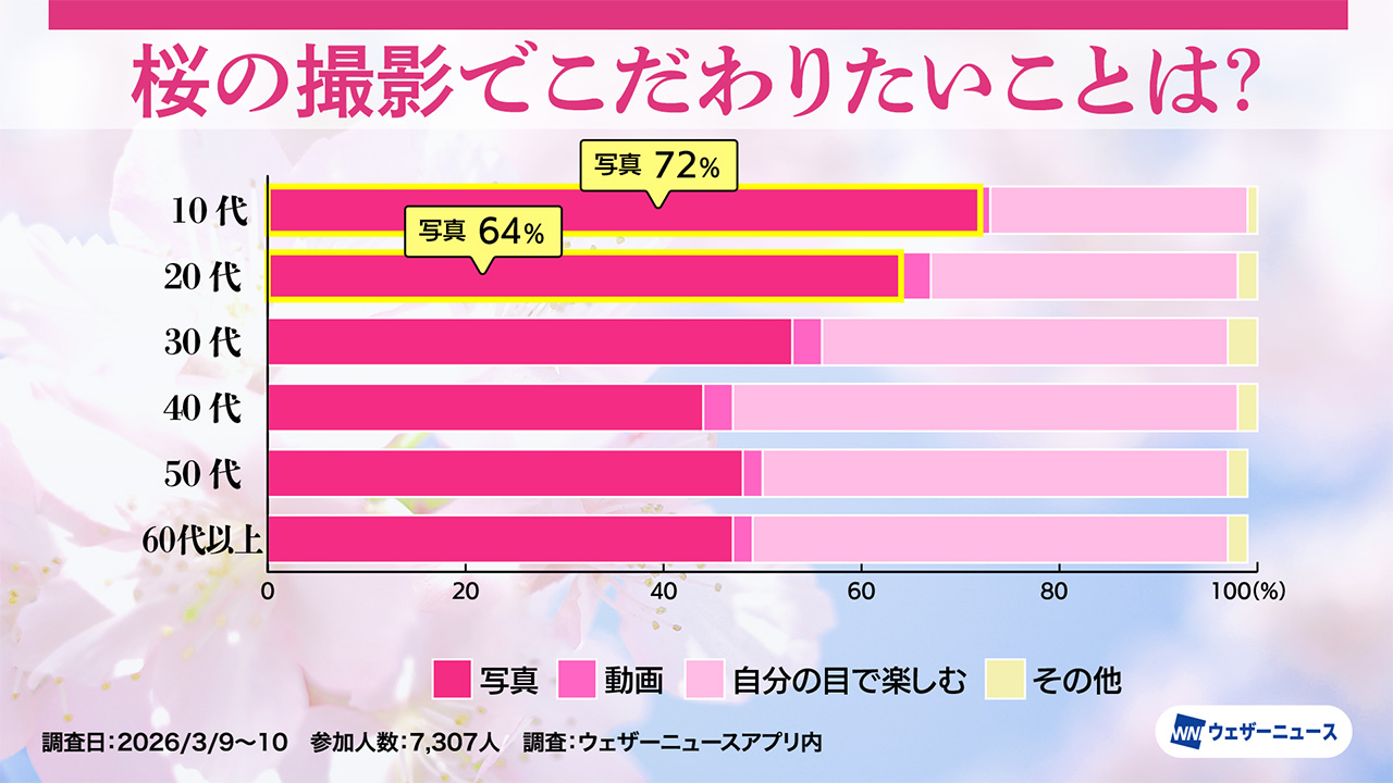 10代の72%、20代の64%が「写真」と回答し、若い世代にとってのお花見は桜の美しさを写真に収め、後から見返したりSNSで共有したりして楽しむことまでがセットになっているのかもしれない。