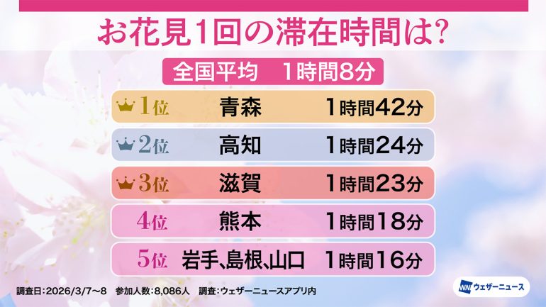 都道府県別では、予算額に続きこちらも青森県がトップで、1時間42分という結果に。青森県には日本三大夜桜の一つにも数えられる弘前公園がある土地柄や桜を愛でる文化が深く根付いていることが伺える。