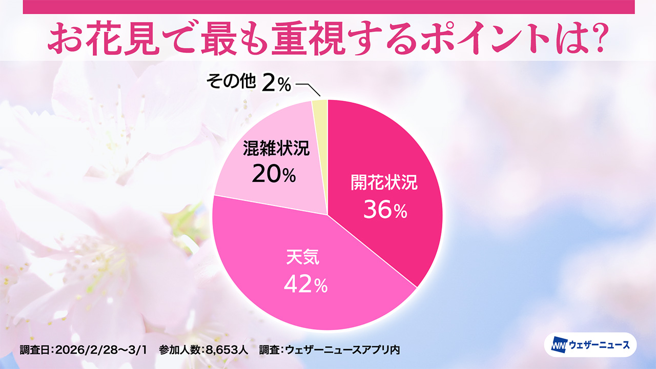 回答を集計した結果、「天気」が42%で最も多く、次いで「開花状況」が36%、「混雑状況」が20%と続く。