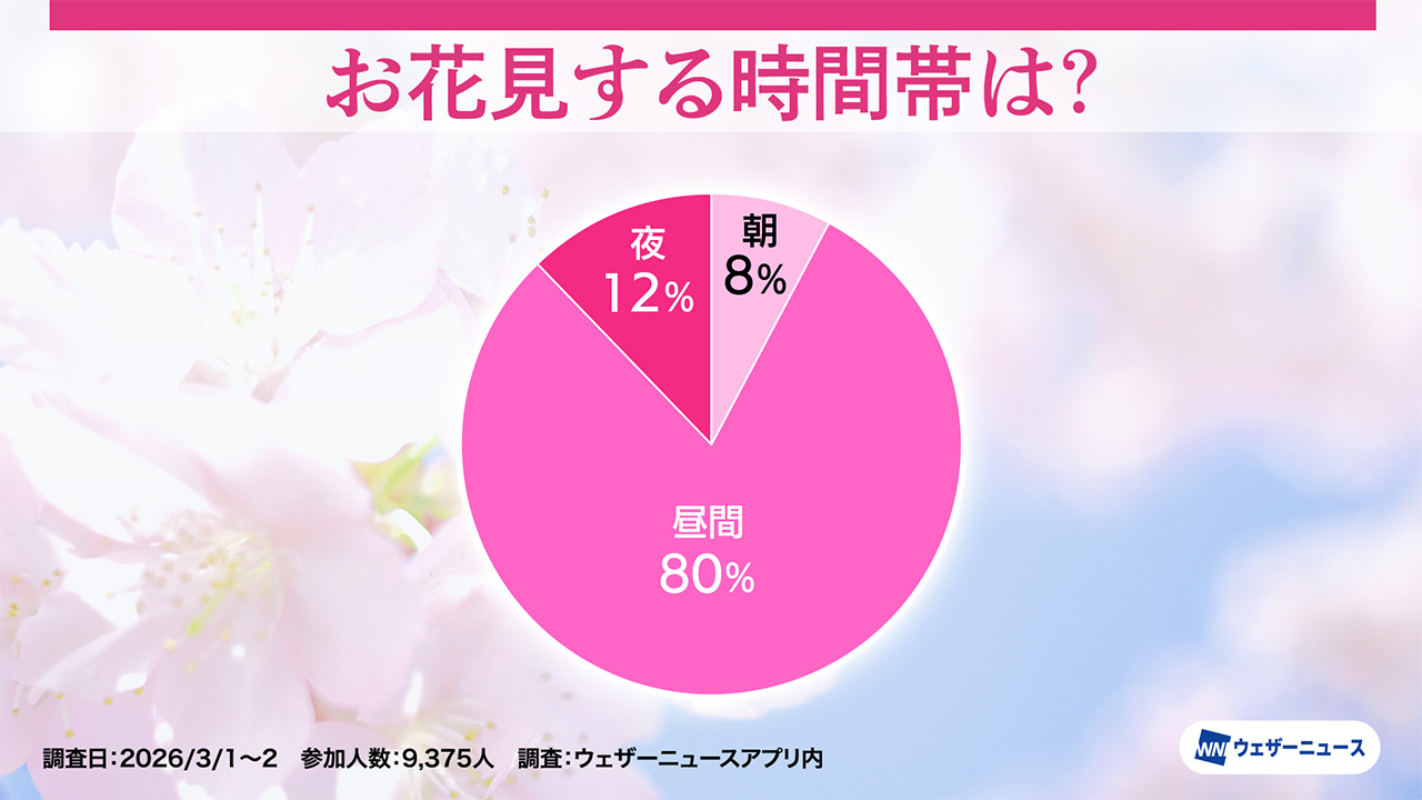 回答を集計した結果、最も多かったのは「昼間」で80%、次いで「夜」が12%、「朝」は8%。最も人気の時間帯は「昼間」で、多くの人が暖かい時間帯や青空の下でのお花見を楽しみにしているようだ。