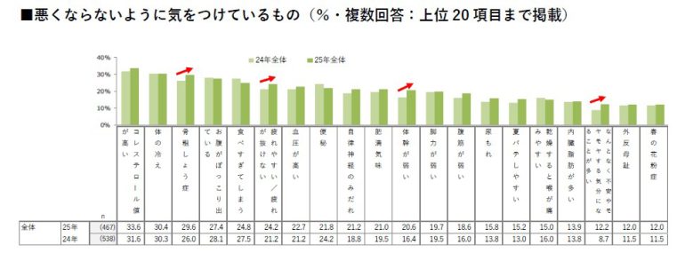 身体に関して悪くならないように気をつけていることでは、「コレステロール」(34%)がトップで、それに「体の冷え」(30%)が続いた。「骨粗しょう症」は、2024年から3.6ポイント増加して5位から3位にランクアップ。2024年から3ポイント以上増加していたのは、「疲れやすい/疲れが抜けない」、「体幹が弱い」、「なんとなく不安やモヤモヤする気分になることが多い」という項目だった。