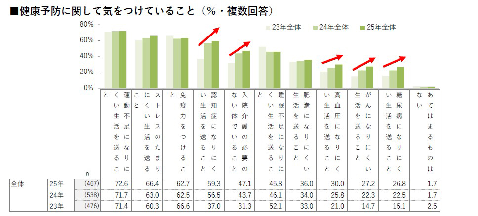 それによれば健康予防で気をつけていることとして”認知症予防“や”病気になりにくい生活を送る”が2023年から増加傾向にあることがわかった。