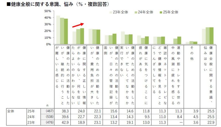 健康に関する意識については、「健康のための活動をしたいが継続的に行うことが難しいと感じる」が38.3%で突出して高かった。「健康に関する正しい情報がわからない、何を信じたらよいのかわからない」は2023年の18.9%から2025年では24.0%と5.1ポイントも増えて増加傾向だ。