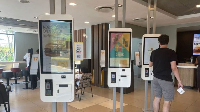 今回、そのバーガーを試してみようと思い、近所のマクドナルドへ向かった。店舗によって広さや雰囲気は違うようだが、店内は想像していたよりもモダンで、内装も綺麗。注文はタッチパネル式の機械で行い、カウンターで商品を受け取る仕組みだ。さらに2階席もあり、広々としていた。一方で、安全対策のため警棒を持ち腰には手錠をつけた警備員が入口付近に立っており、比較的安全な場所ではあるものの、南アフリカならではの治安への意識の高さも感じられた。