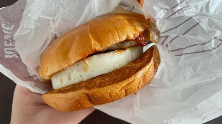 通常のバーガーと同じく牛肉を使用していて見た目は一般的なパテと変わらないものの、一口食べると味がまったく異なる。スパイスやハーブが効いたブルボス特有のほのかな風味を感じられ、ハッシュポテトのサクサク感も量もちょうど良かった。またピリッとした辛さがパテと合い、ハラペーニョソースが味を引き立てているように感じた。個人的には、ケチャップの味が強いエッグバーガーよりも、ハラペーニョソースの方が好みだった。