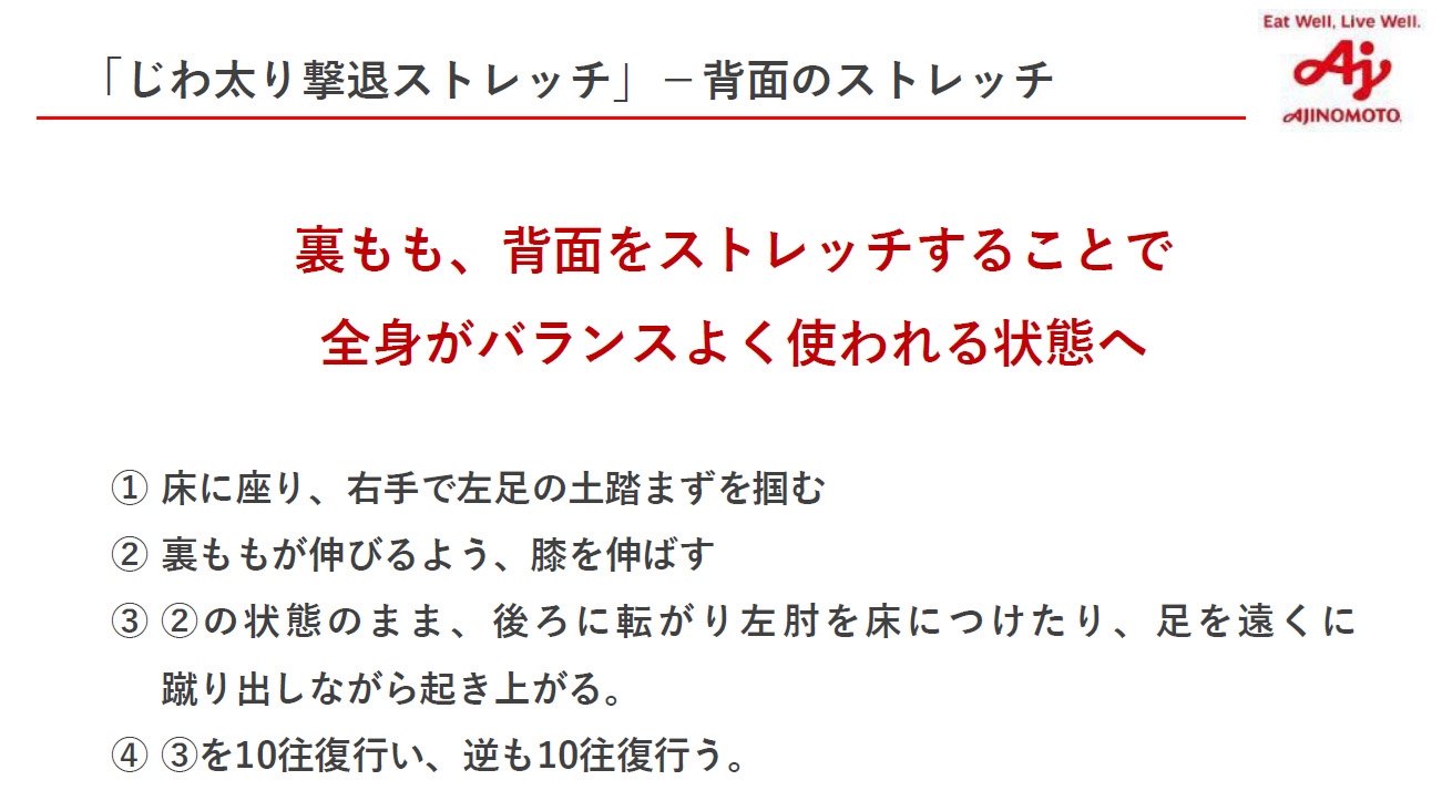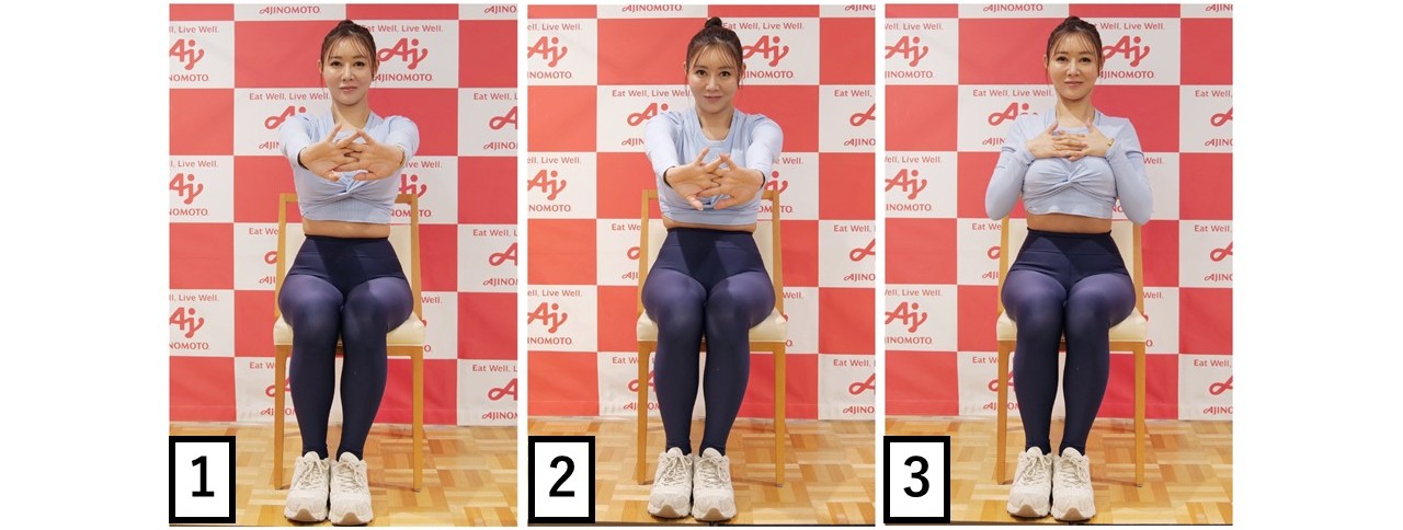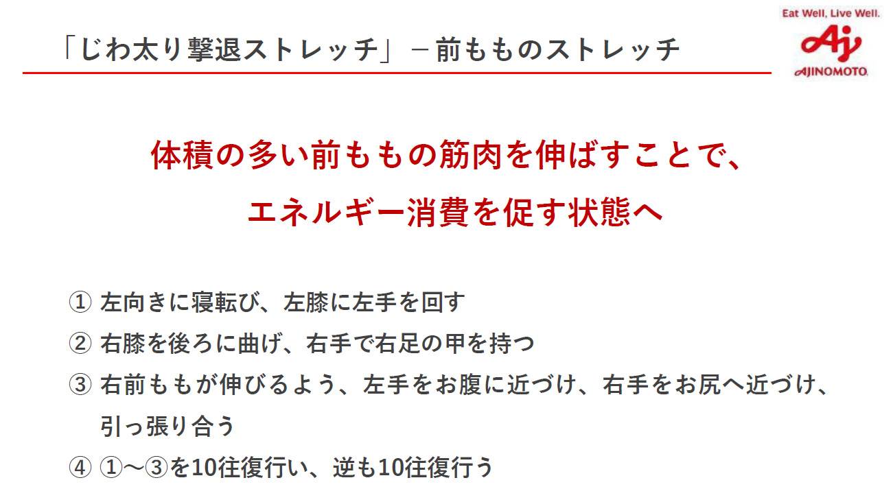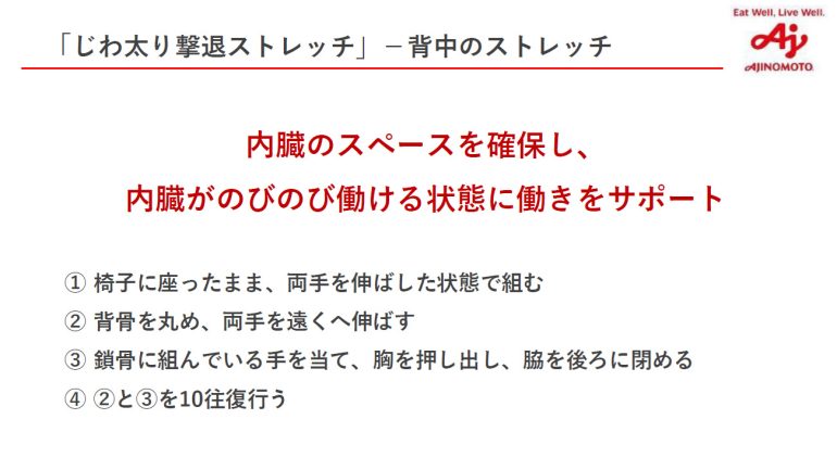 Yumico氏は「じわ太り撃退ストレッチ」として4つのストレッチを紹介。いずれも簡単にできるストレッチだが、“呼吸の質を上げる”効果が期待できるという。