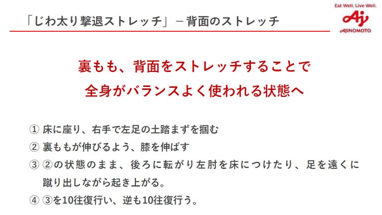 今回のYumico氏の話を伺い、普段は呼吸を意識することはなく、デスクワークが多いので猫背になっており、肩回りや股関節が硬くなっていると、じわ太りの条件にぴったり当てはまっていた。もはや痩せることは無理だと諦観しているが、とりあえず簡単にできる4つのストレッチを実践して、「カプシEX」も試してみようかと思う。