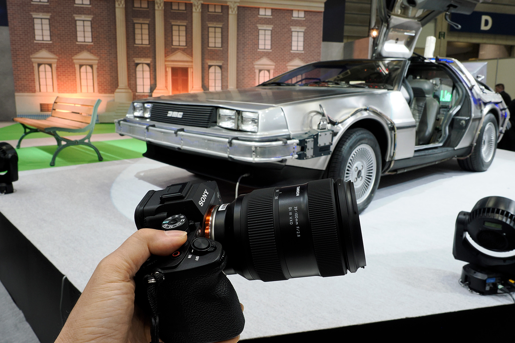 今年のTAMRONは映画「バック・トゥ・ザ・フューチャー」に登場したタイムマシンのデロリアンを展示! 「35-100mm F2.8 Di III VXD」は、まさにタイパを象徴する一本。フルサイズ用F2.8通しの大口径ズームでありながら、驚くほど軽量。柔らかなボケ味と、機動力を両立させたこのスペックは、旅を愛するフォトグラファーの強い味方になるはずだ。