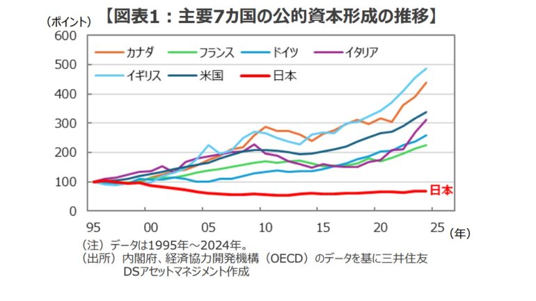 1995年以降の主要7カ国の公的資本形成の推移を振り返ると、イギリスが約4.9倍、米国が約3.4倍に拡大、最も伸びの小さかったフランスでも約2.3倍に拡大しているが、日本は約0.7倍にとどまっている(図表1)。